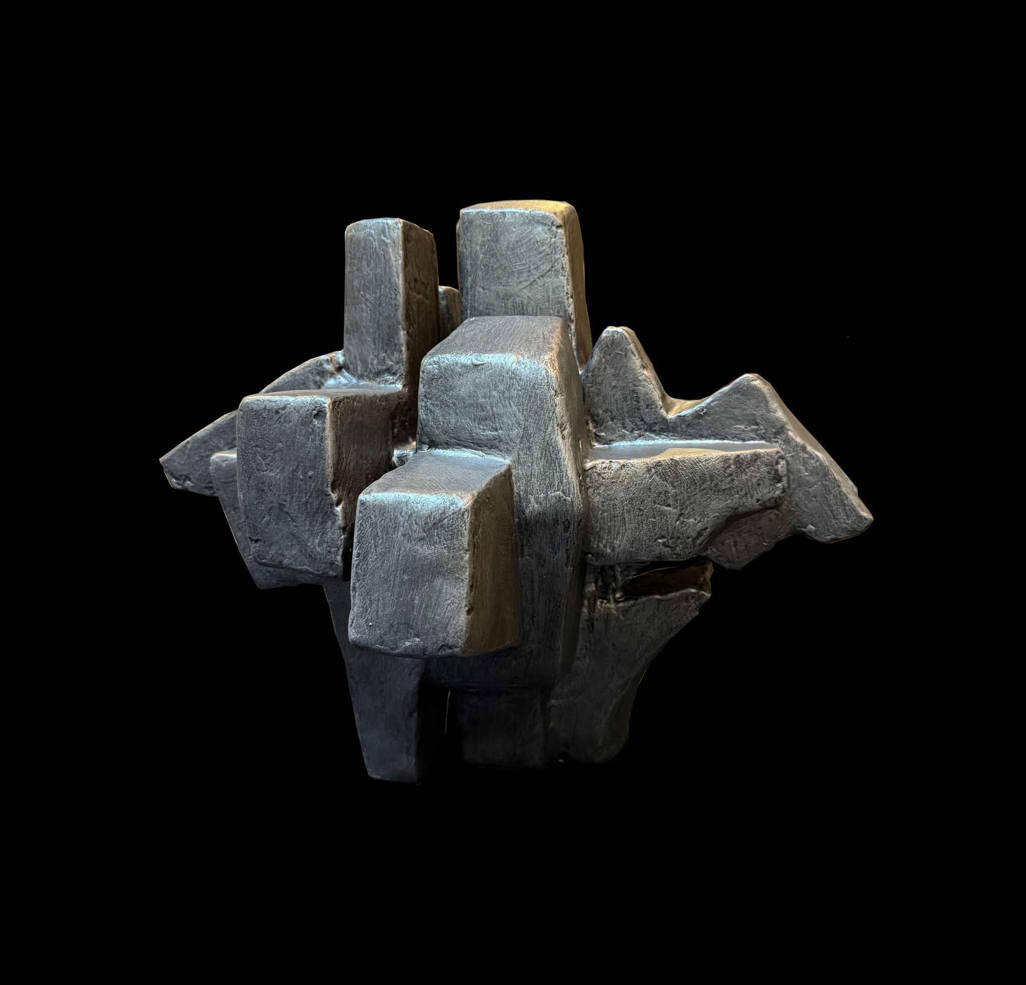 Dan Schneiger’s architectural roots shine through in his creations, which encompass sculpture, furniture and lighting. He works with a vast array of materials, including wood, plaster, resin, rubber, pigment and found objects. A portion of every sculpture is also composed of construction debris diverted from becoming landfill. He pieces these materials together like building blocks to create geometric forms that resemble architectural maquettes- visions of monolithic structures, complex cityscapes or striking rock formations.