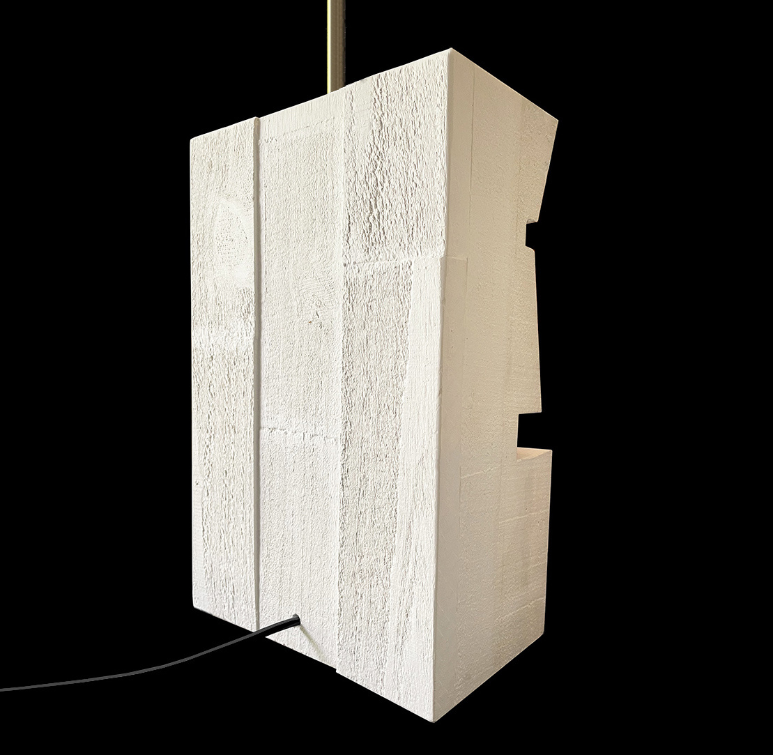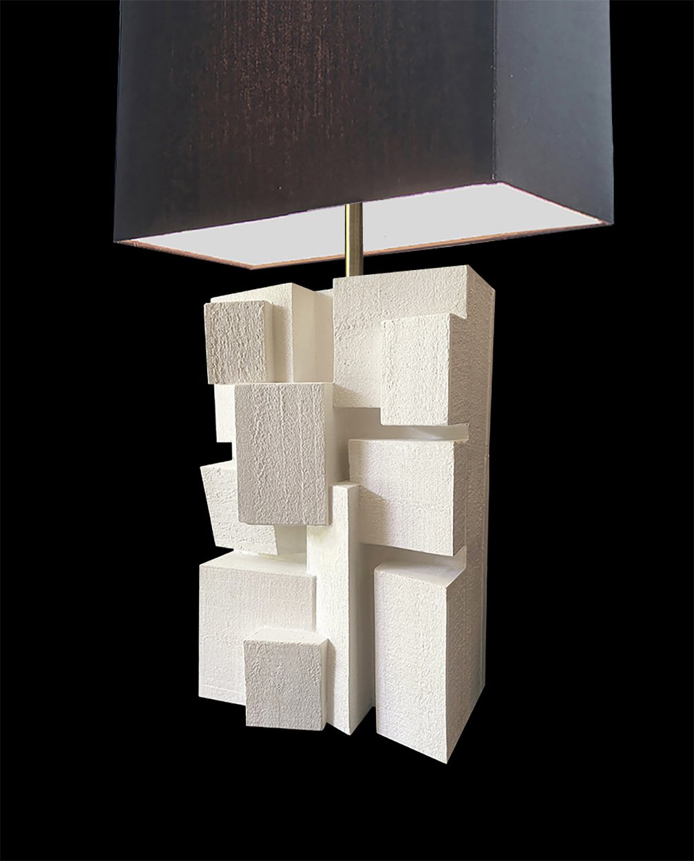 Dan Schneiger’s architectural roots shine through in his creations, which encompass sculpture, furniture and lighting. He works with a vast array of materials, including wood, plaster, resin, rubber, pigment and found objects. A portion of every sculpture is also composed of construction debris diverted from becoming landfill. He pieces these materials together like building blocks to create geometric forms that resemble architectural maquettes- visions of monolithic structures, complex cityscapes or striking rock formations.