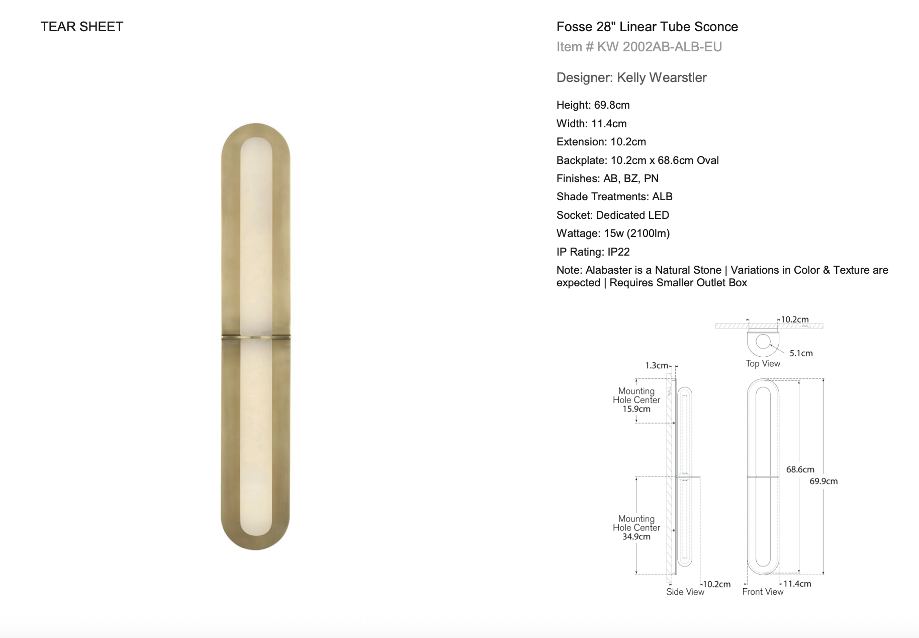 The Fosse 28" Linear Tube Sconce is a striking modern wall light that pairs geometric clarity with the warmth of natural materials. Featuring an alabaster cylinder that emits a soft, ambient glow, this sculptural sconce is mounted on a streamlined metal backplate for a clean, architectural presence. Ideal for contemporary interiors, hallways, vanities, and flanking mirrors, the vertical form and refined proportions bring symmetry and elegance to any space. The natural veining of the alabaster diffuser offers subtle texture, while the metal finish options allow for versatile styling across residential and hospitality applications. Elegant in form and effortless in function, the Fosse 28" Sconce offers elevated design with everyday utility—a timeless lighting statement rooted in quiet sophistication.
