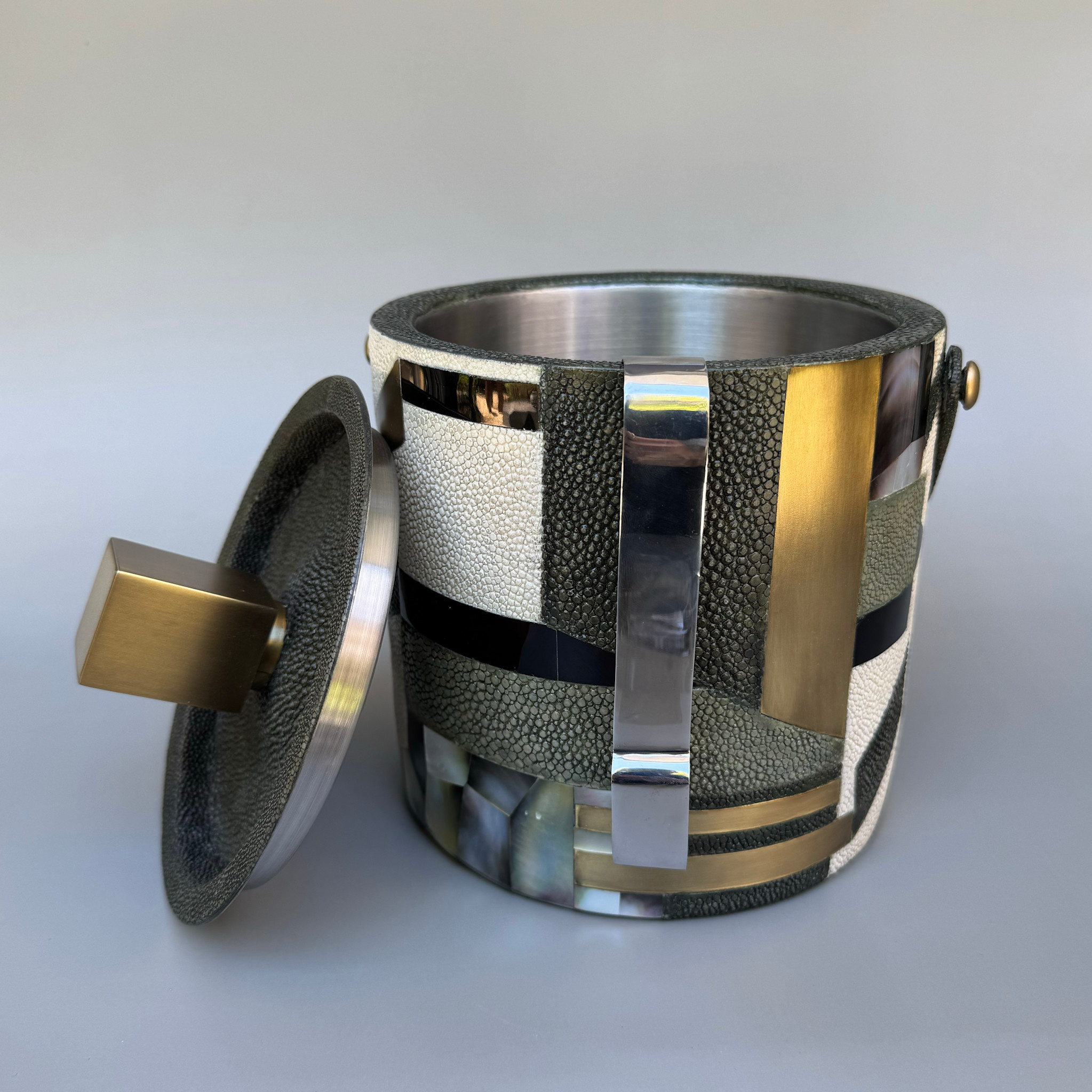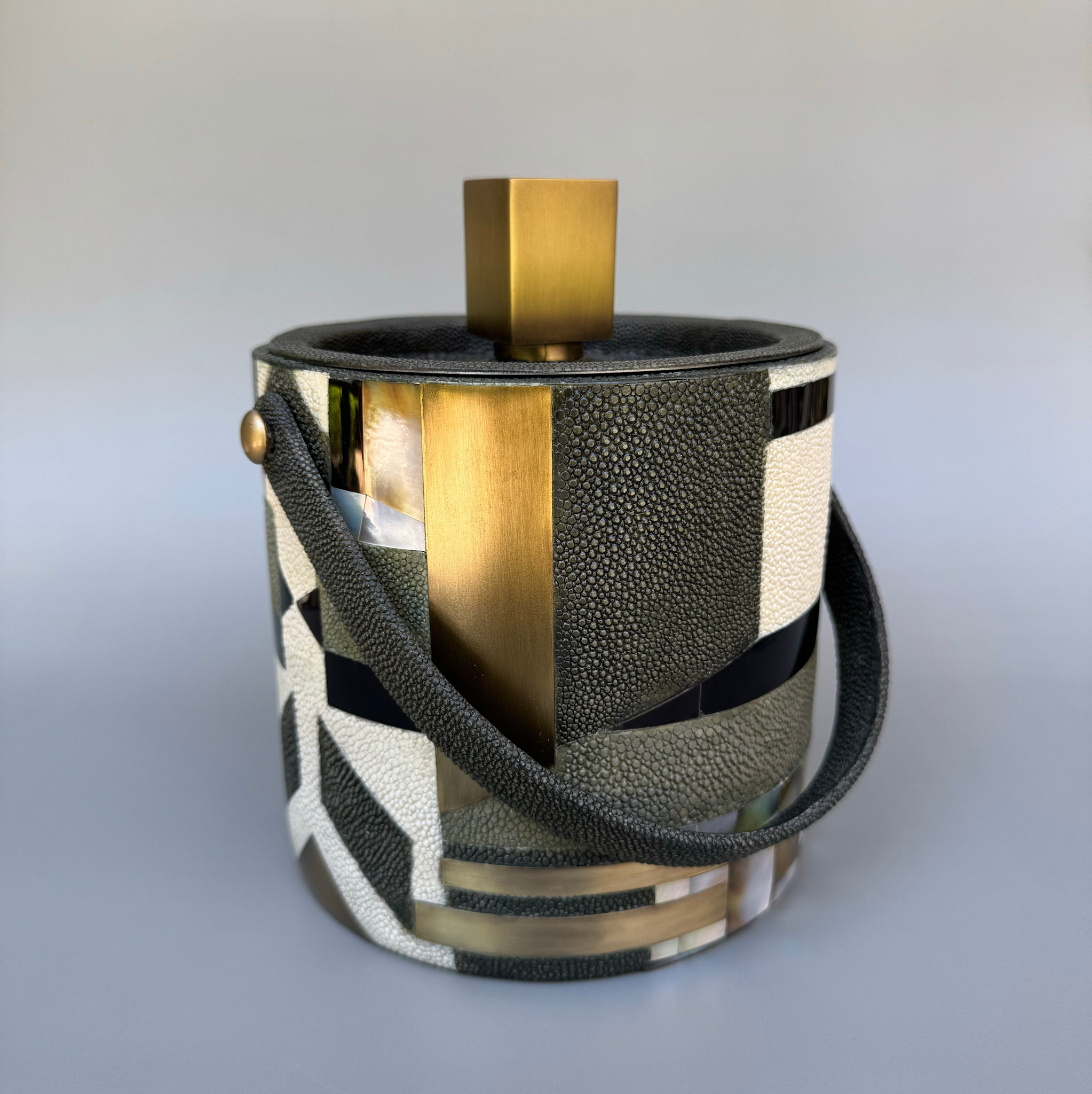 The KIFU PARIS Ice Bucket is the ultimate luxury bar accessory, inlaid in either shagreen, pen shell or a pattern. This piece comes with an ice tong.
